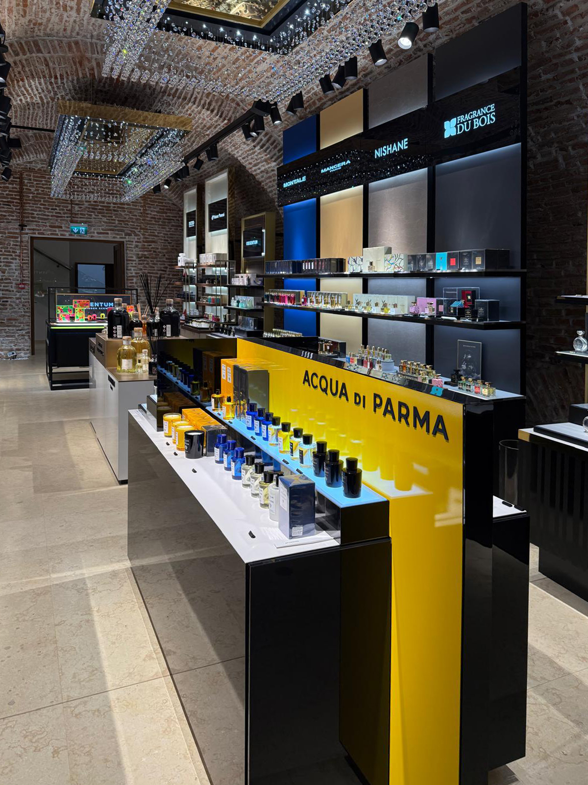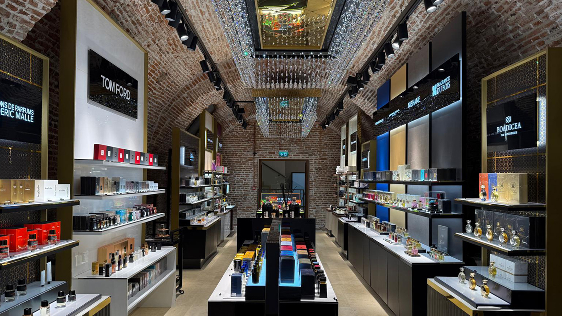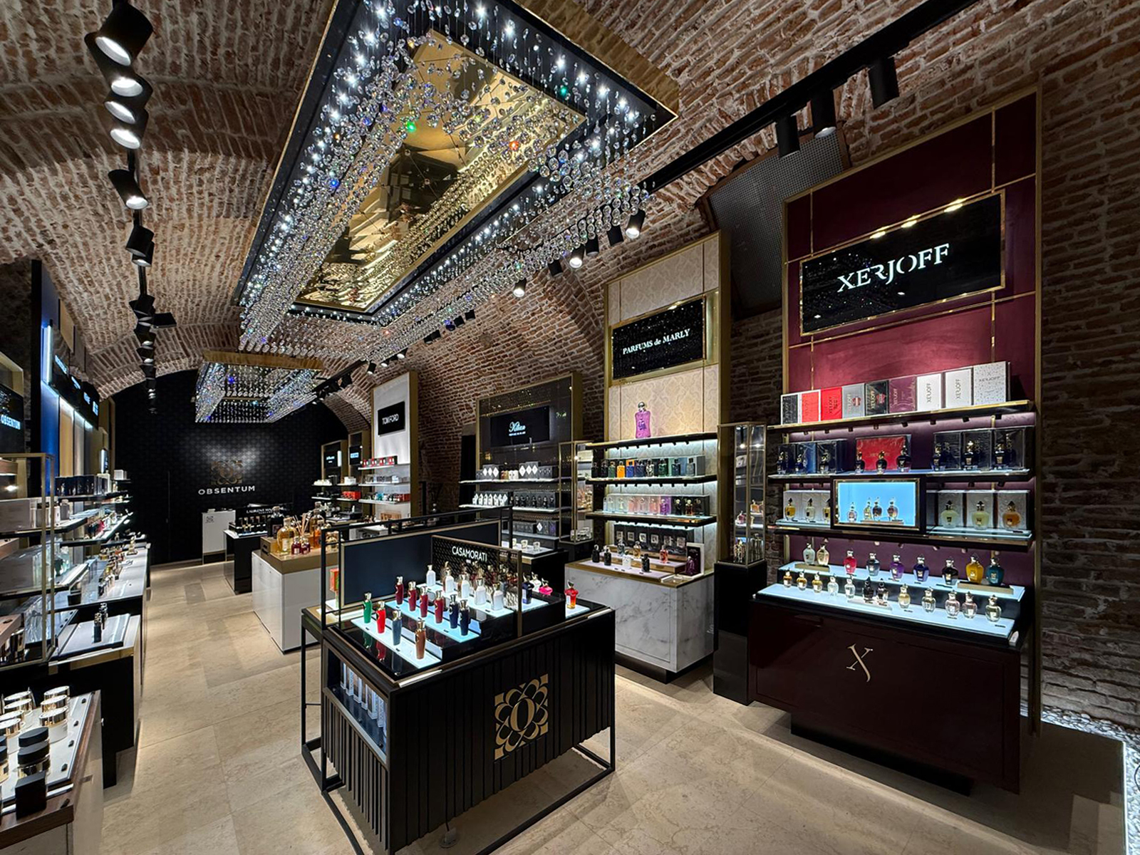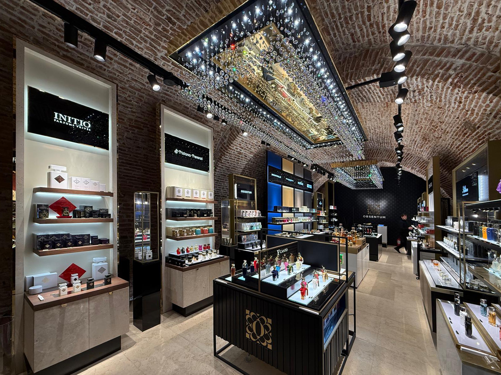 The interior offers a unique scent discovery experience, where the historic vaulted structure