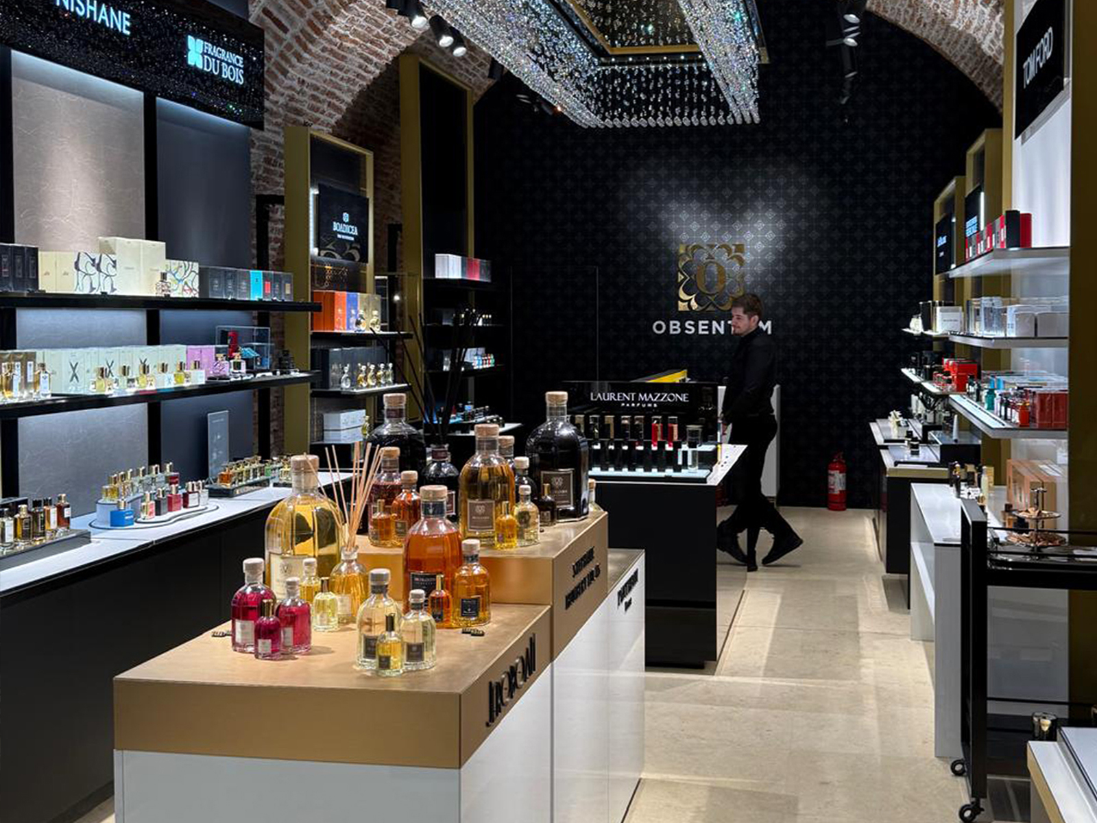 and exposed brick form a strong backdrop for Obsentum's luxurious retail setup.