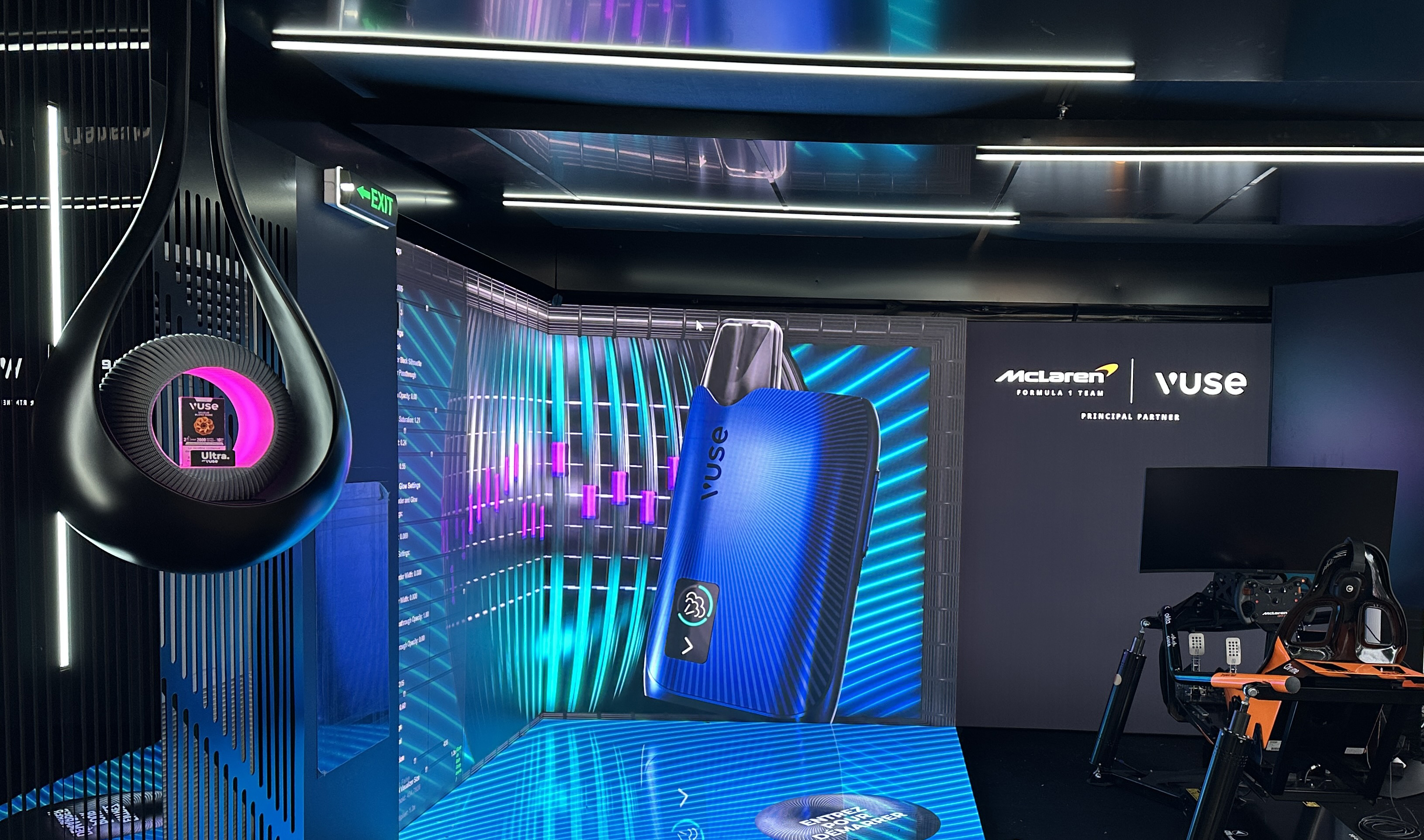 a trial-and-purchase counter with a feature backwall, unique product displays and a Formula 1 VR immersion chair.