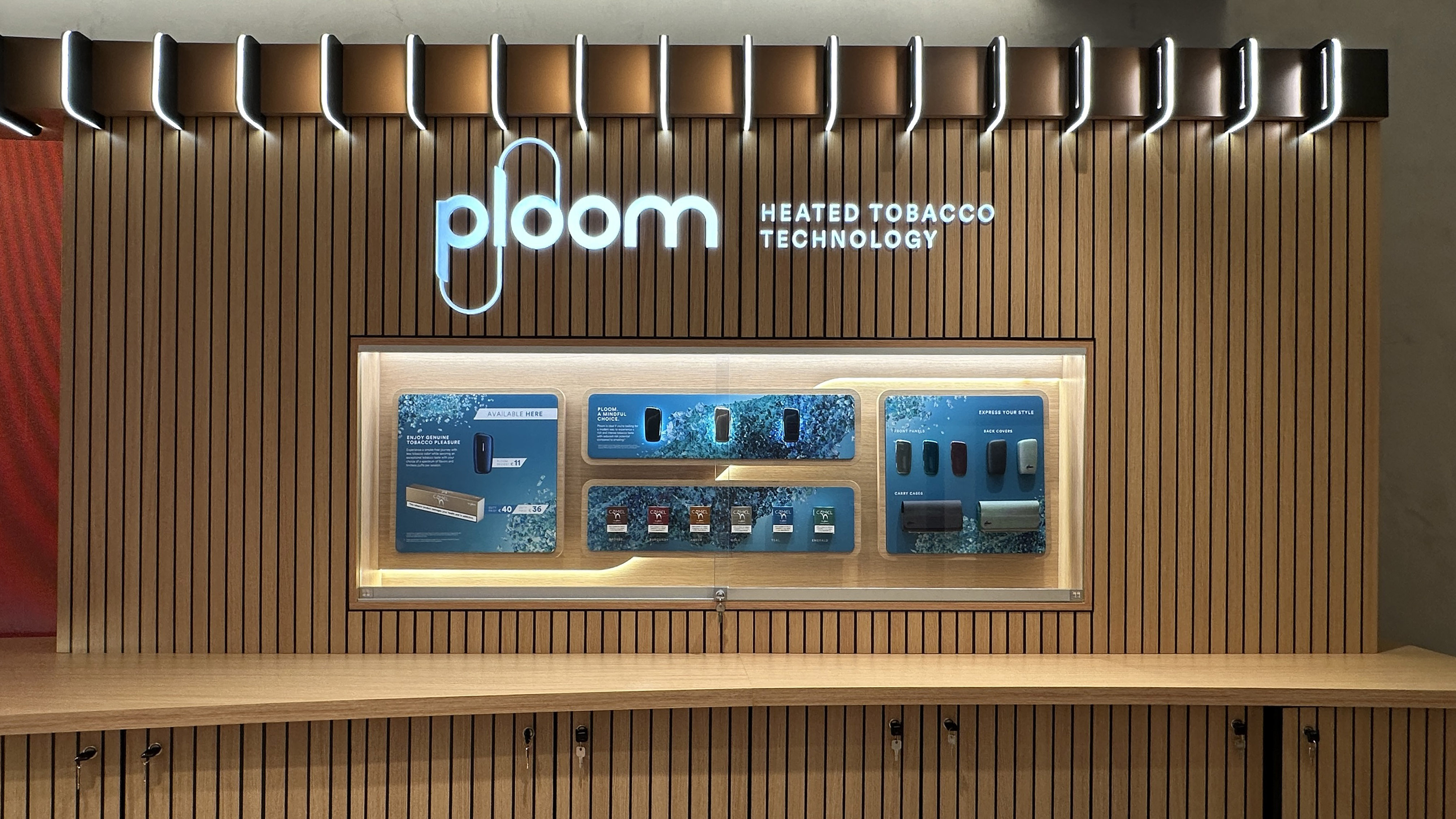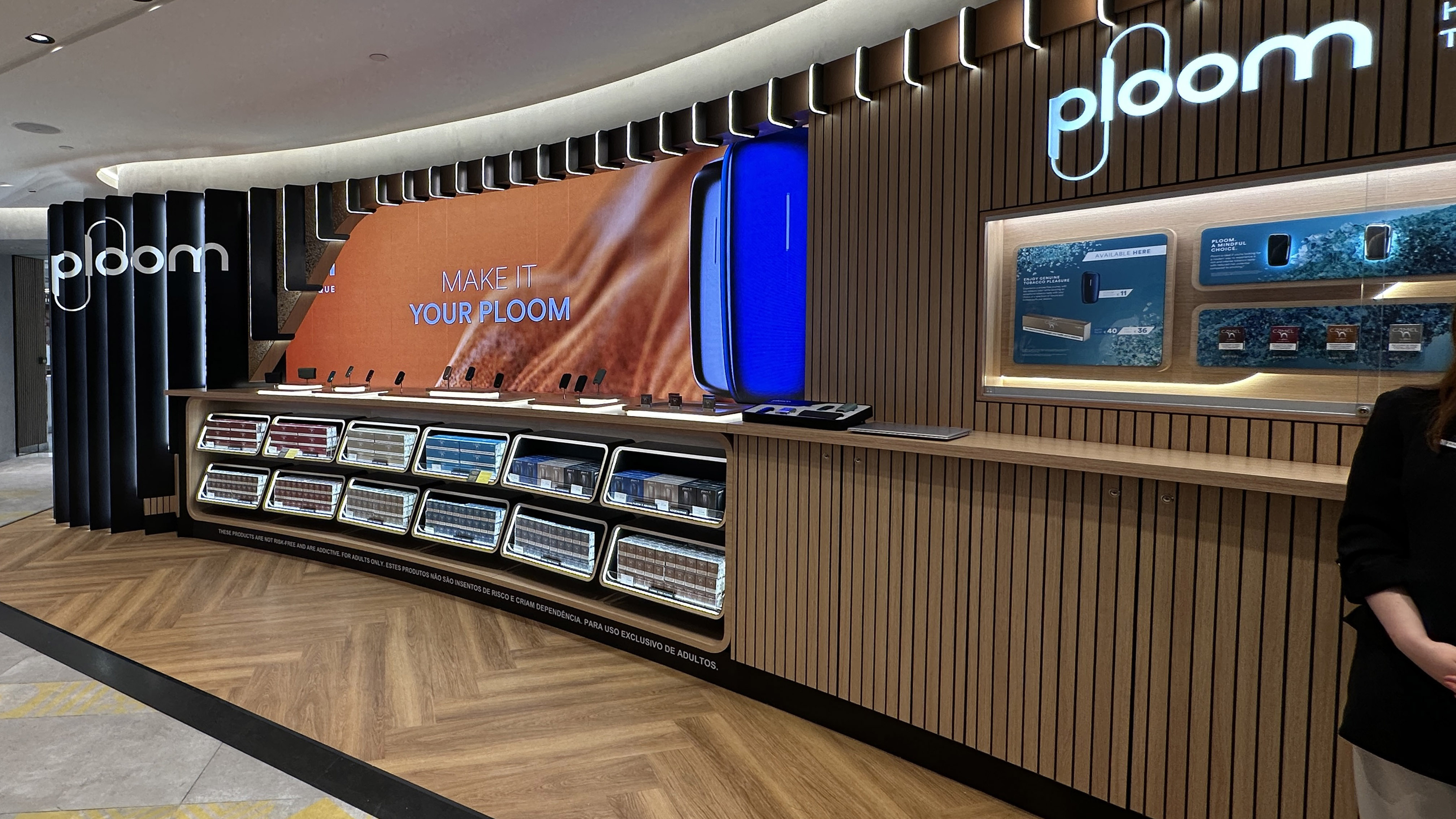 Against a vertical wooden cladding, shoppers can find discreetly illuminated shelving-pods and a brand discovery space for the newst PLOOM devices.